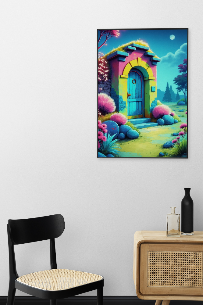 Eine bunt gestrichene Tür mit grasbewachsenem Dach thront inmitten einer verträumten Landschaft. Umgeben von pinken Blüten und weichen Felsen wirkt sie wie der Eingang in eine andere Welt. Der Mond am Himmel verstärkt die magische Atmosphäre dieses geheimnisvollen Ortes