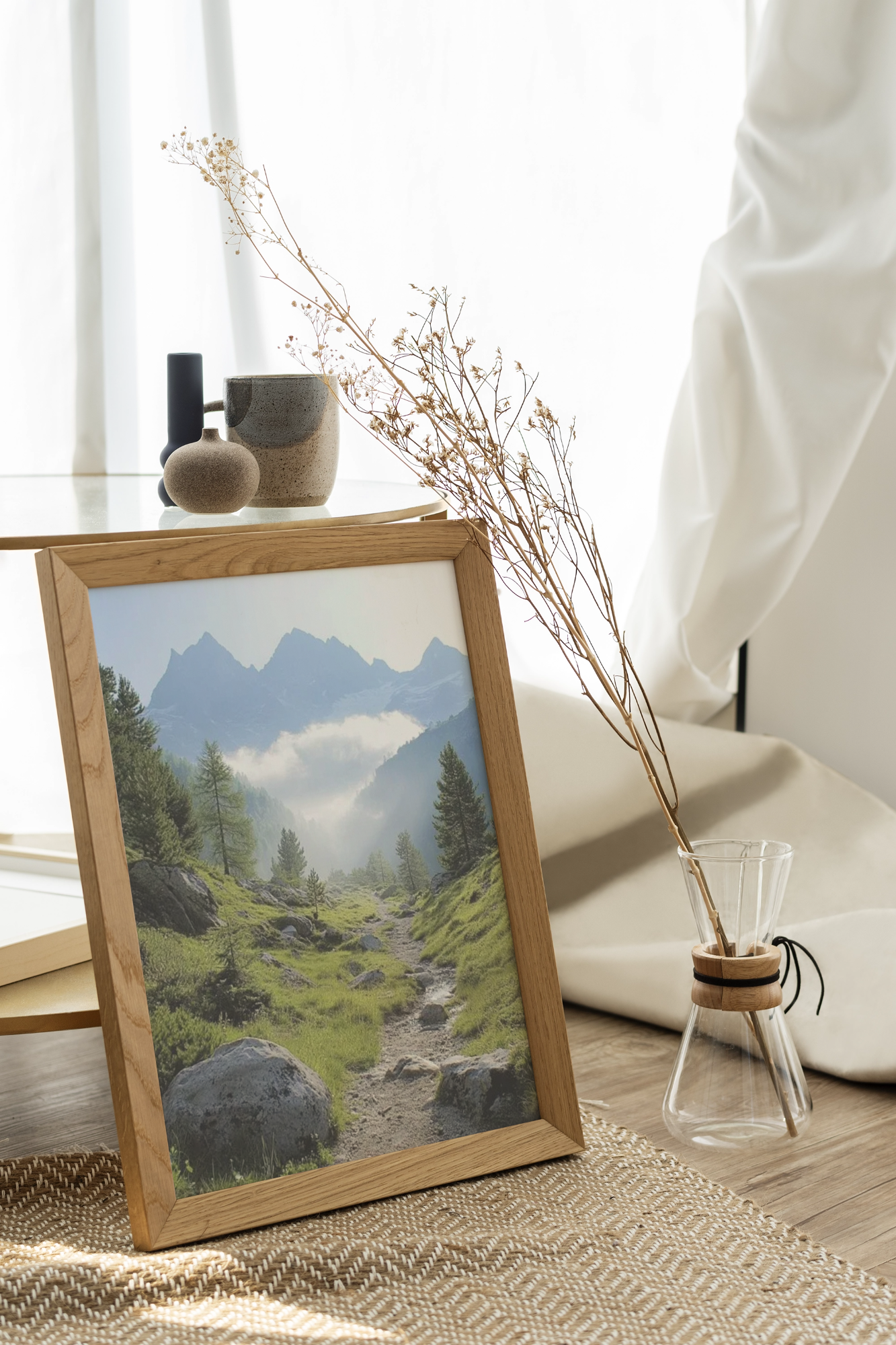 Ein stiller Pfad schlängelt sich durch sattgrünes Tal, während Nebel sanft an den Bergflanken tanzt und die Gipfel majestätisch über allem thronen. Dieses Bild lädt zum Innehalten ein – eine Hommage an die Ruhe der Natur und die Kraft der Berge.