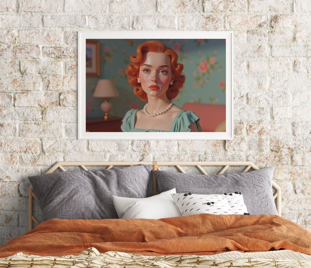 Eine Frau mit ausdrucksstarkem Blick, deren Stil und Erscheinung an die klassische Eleganz der 1950er Jahre erinnert. Rote Locken, Perlenkette und ein zarter Teint betonen ihre zeitlose Schönheit. Die nostalgische Atmosphäre wird durch das florale Ambiente im Hintergrund unterstrichen
