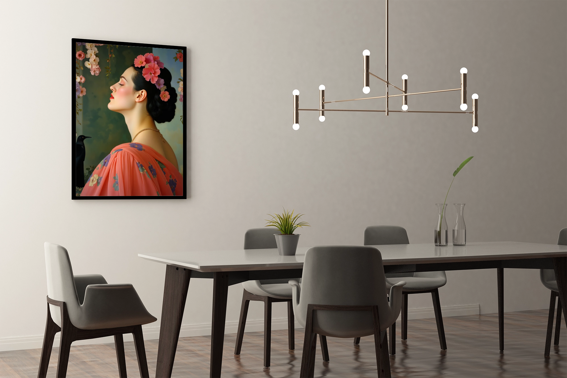 Das Bild zeigt eine Frau in traditionell anmutender Kleidung, die mit Blumen im Haar und einem floralen Kleid geschmückt ist. Ihr seitliches Profil strahlt Ruhe und Anmut aus, während zarte Blütenranken die Szene umrahmen. Ein schwarzer Vogel im Hintergrund verstärkt die poetische und geheimnisvolle Atmosphäre.