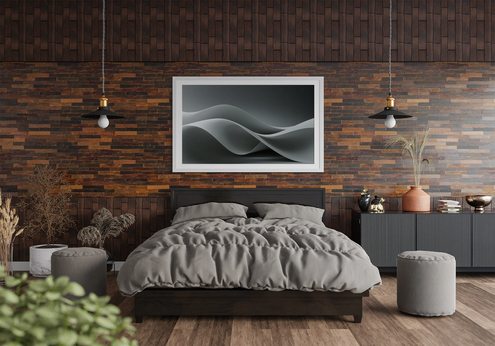 Sanfte weiße Wellen fließen über einen dunklen Hintergrund und schaffen eine minimalistische, moderne Ästhetik. Das Spiel aus Licht und Schatten verleiht dem Motiv Tiefe und Dynamik. Perfekt für alle, die klare Linien und zeitlose Eleganz lieben