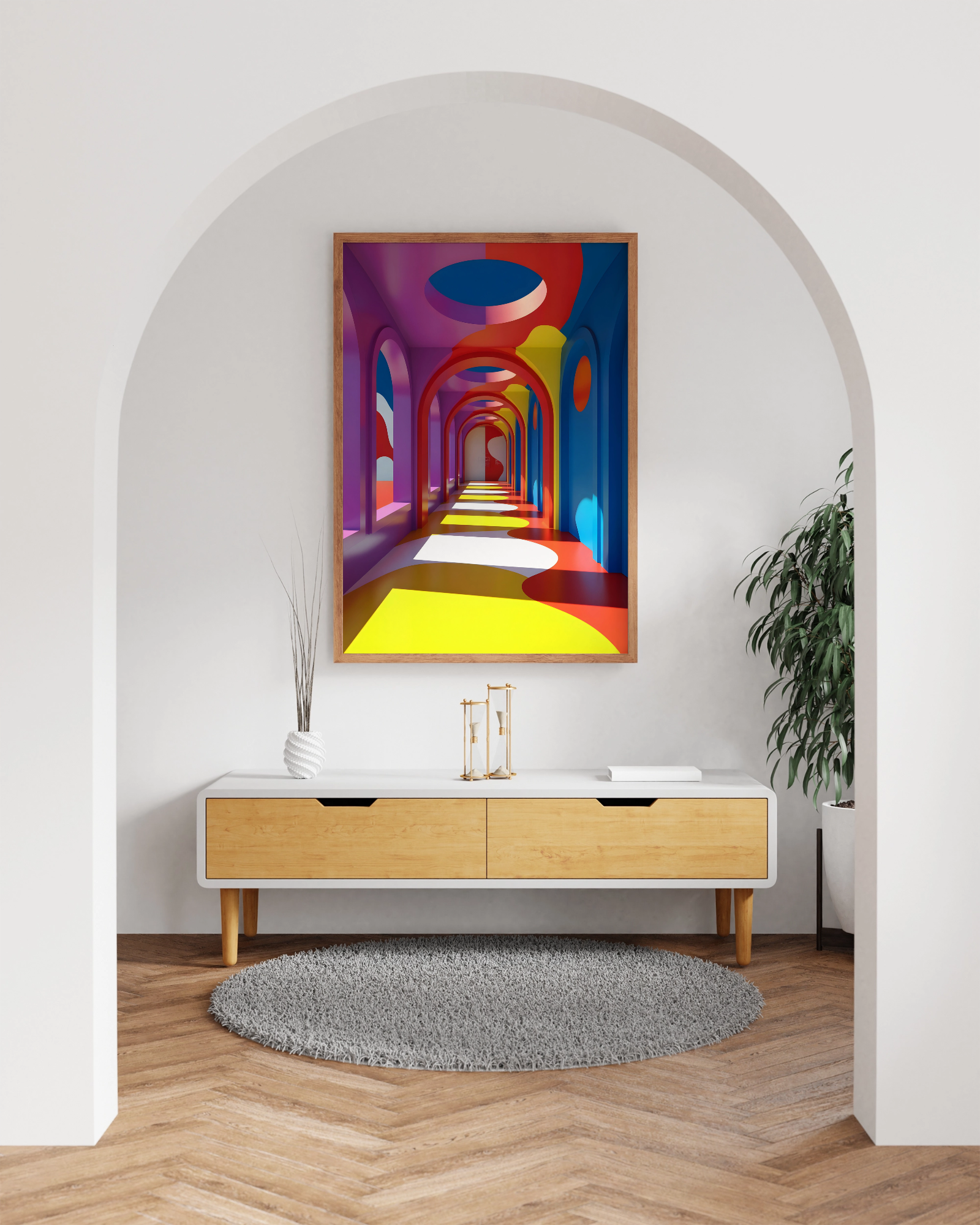 Ein langer Korridor mit hohen Bögen und runden Deckenöffnungen erstrahlt in kräftigen Farben wie Gelb, Rot, Blau und Violett. Die intensiven Farbflächen und das Spiel von Licht und Schatten erzeugen eine surreal wirkende, fast traumhafte Atmosphäre. Diese abstrakte Architektur lädt zum Staunen und Verweilen in einer Welt jenseits des Alltäglichen ein.