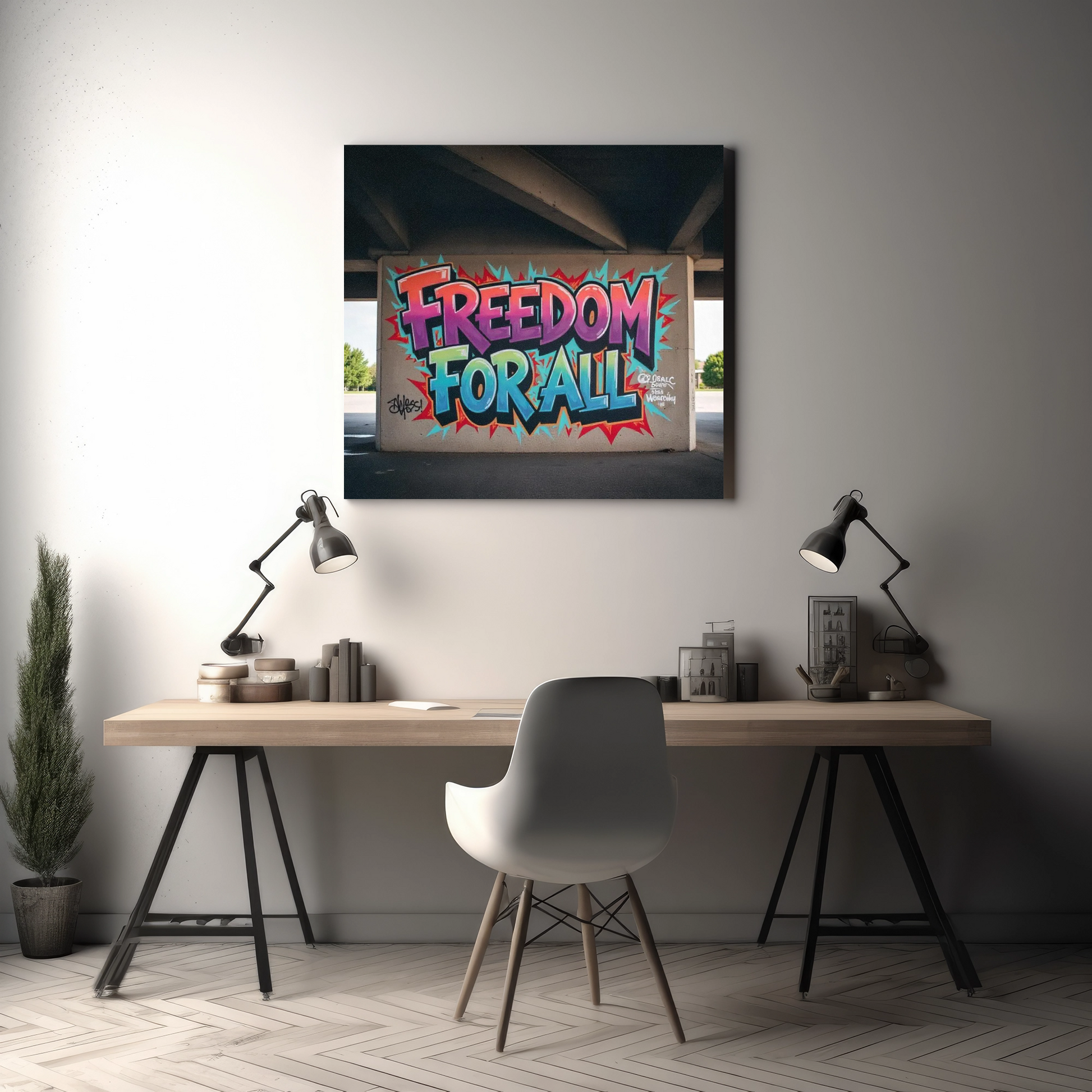 Ein kraftvolles Graffiti mit dem Slogan „Freedom for All“ prangt farbenfroh auf einer Betonwand unter einer Brücke. Die leuchtenden Buchstaben in Rot, Lila, Blau und Türkis sind von dynamischen Sternenformen umgeben und ziehen sofort alle Blicke auf sich. Das Werk setzt ein starkes Statement für Gleichheit und Ausdrucksfreiheit im öffentlichen Raum