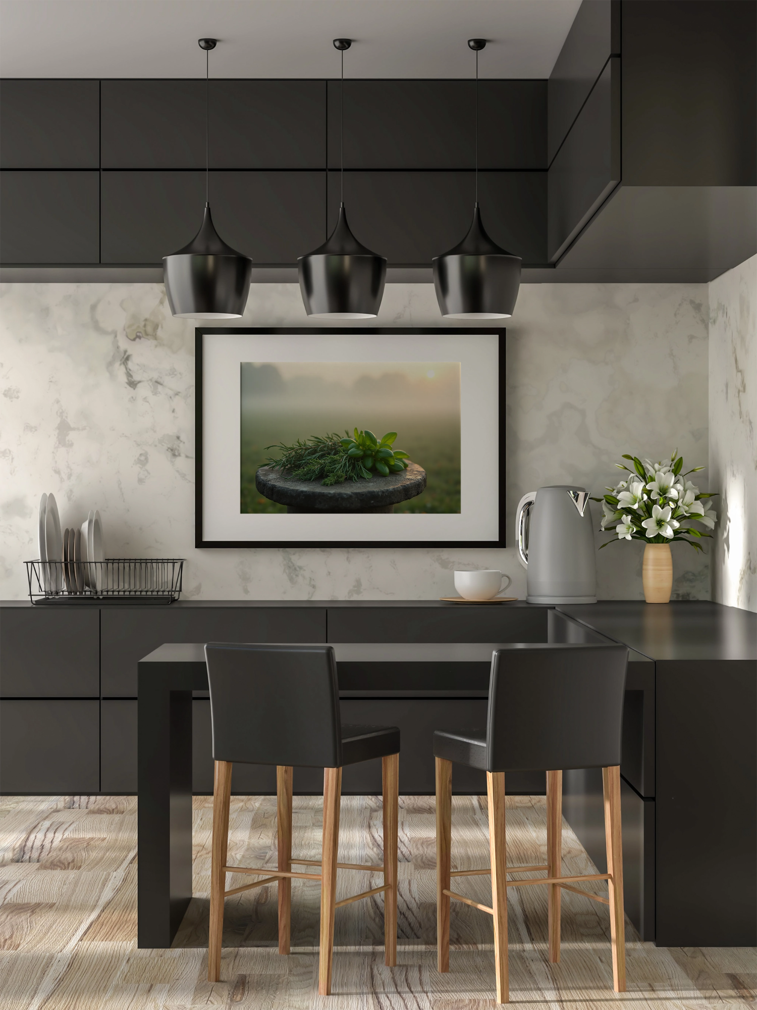 Ein Bündel frischer Kräuter liegt auf einem steinernen Sockel, während der Nebel sanft über die Wiese zieht. Das warme Licht der aufgehenden Sonne verleiht der Szene eine friedliche und natürliche Atmosphäre. Dieses Bild strahlt Ruhe, Reinheit und die Schönheit des einfachen Moments aus.