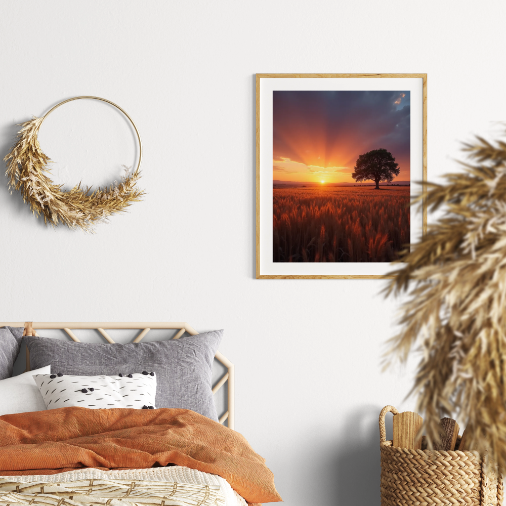 Die Sonne versinkt hinter dem Horizont und taucht das Weizenfeld in warmes, goldenes Licht. Ein einzelner Baum steht still in der Weite und wacht über den Tag. Es ist der Moment, in dem Stille und Schönheit eins werden