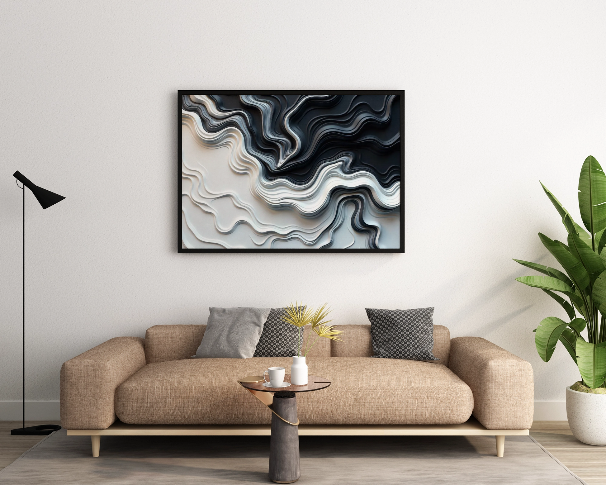Fließende Schwarz-Weiß-Wellen verschmelzen zu einem hypnotischen Muster, das Tiefe und Dynamik ausstrahlt. Die abstrakten Formen wirken fast dreidimensional und ziehen den Blick magisch an. Ein modernes Wandbild für alle, die Kontraste lieben und Stil mit Wirkung suchen