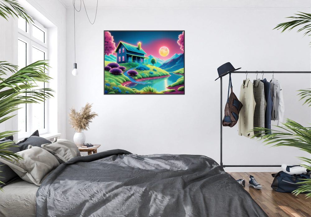Ein idyllisches Häuschen erstrahlt in leuchtenden Neonfarben am Ufer eines klaren Flusses. Umgeben von farbenfrohen Bäumen und Bergen wirkt die Szene wie ein Traum in Pastell und Neon. Der volle Mond taucht die Landschaft in magisches Licht