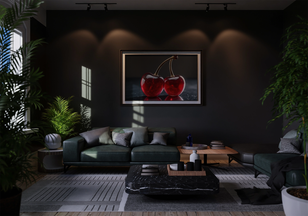 Dieses Paar glänzender Kirschen vereint Eleganz und Perfektion in klarer, fast gläserner Optik. Das tiefe Rot wirkt lebendig und zieht sofort den Blick auf sich. Ein Bild, das Sinnlichkeit und Ästhetik in einer einzigartigen Form verbindet.
