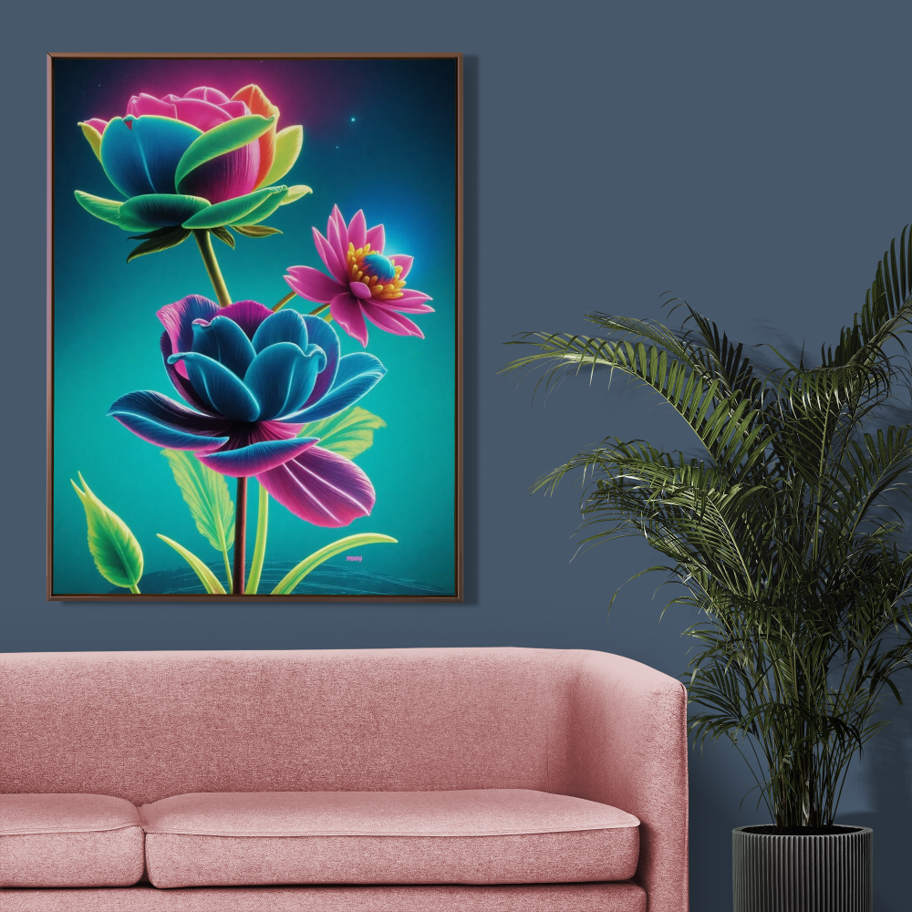 Drei Blumen erstrahlen in kräftigen Neonfarben aus Blau, Pink und Grün. Die detailreichen Blüten wirken wie ein Mix aus Natur und Fantasie. Ein futuristisches Kunstwerk, das sofort ins Auge fällt