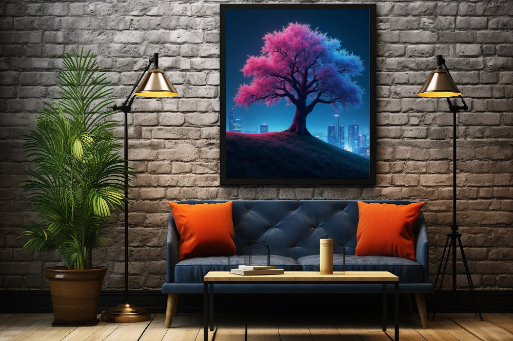 Ein einzelner Baum strahlt in pinkem und blauem Glanz über der nächtlichen Skyline. Seine Farben vermischen Natur und Neon zu einem magischen Anblick. Er steht wie ein Symbol für Ruhe mitten im urbanen Chaos