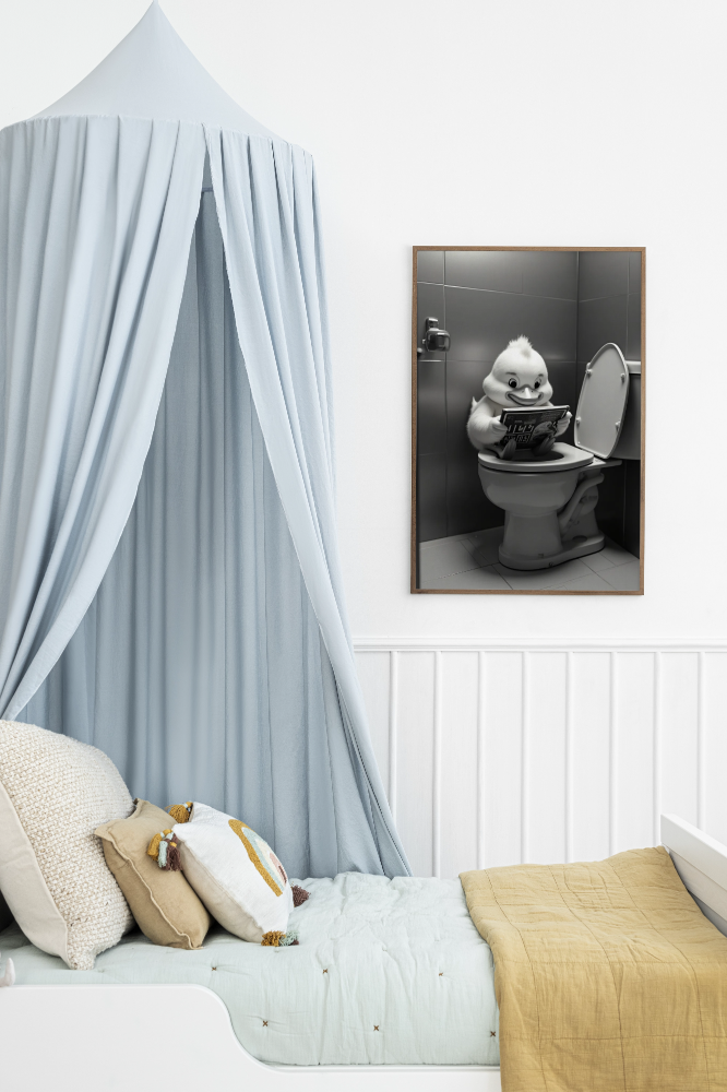 Ein kleines Entenküken sitzt gemütlich auf der Toilette und vertieft sich mit ernster Miene in ein Comic-Heft. Der kontrastreiche Schwarz-Weiß-Look verleiht der Szene einen humorvollen, fast filmischen Charakter. Ein Bild, das Alltägliches mit Witz und Charme in Szene setzt