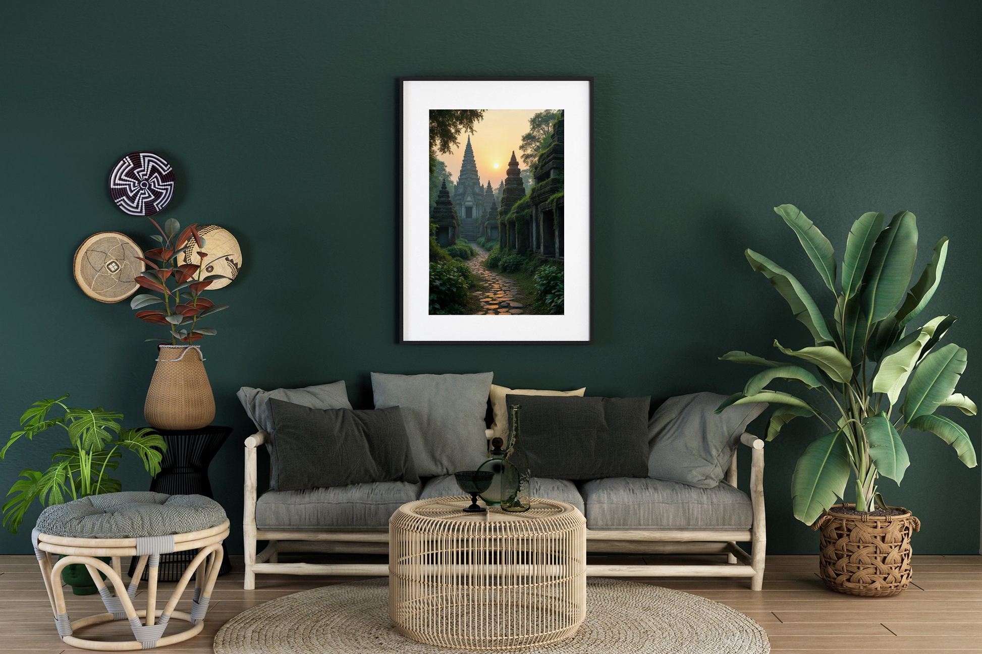 Ein verwunschener Steinpfad führt durch eine von Moos überwucherte Tempelanlage mitten im asiatischen Dschungel. Die aufgehende Sonne taucht die Szene in ein warmes, goldenes Licht und verleiht den alten Mauern eine geheimnisvolle Aura. Umgeben von dichter Vegetation wirkt die Tempelstruktur zeitlos und spirituell – ein Ort der Ruhe und Einkehr.