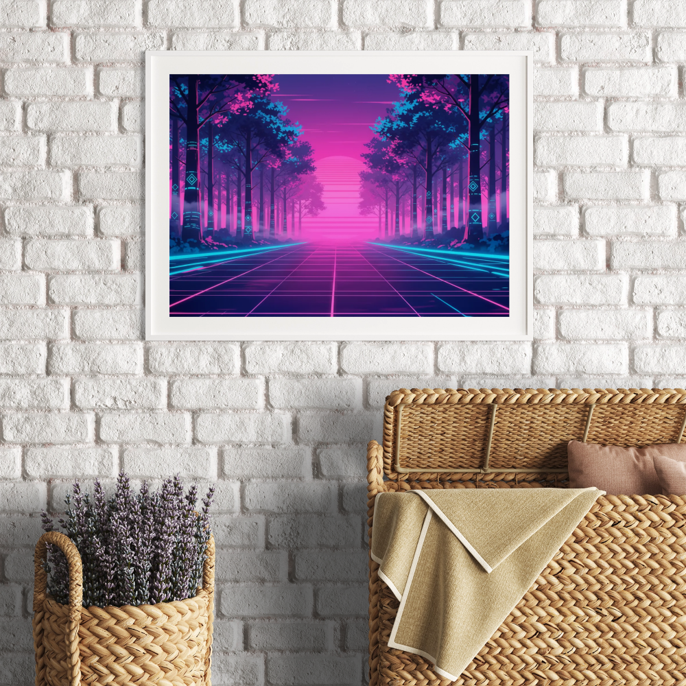 Eine futuristische Allee aus leuchtenden Bäumen führt in Richtung eines riesigen pinken Sonnenuntergangs. Natur und Cyber-Ästhetik verschmelzen zu einem surrealen Traumwald