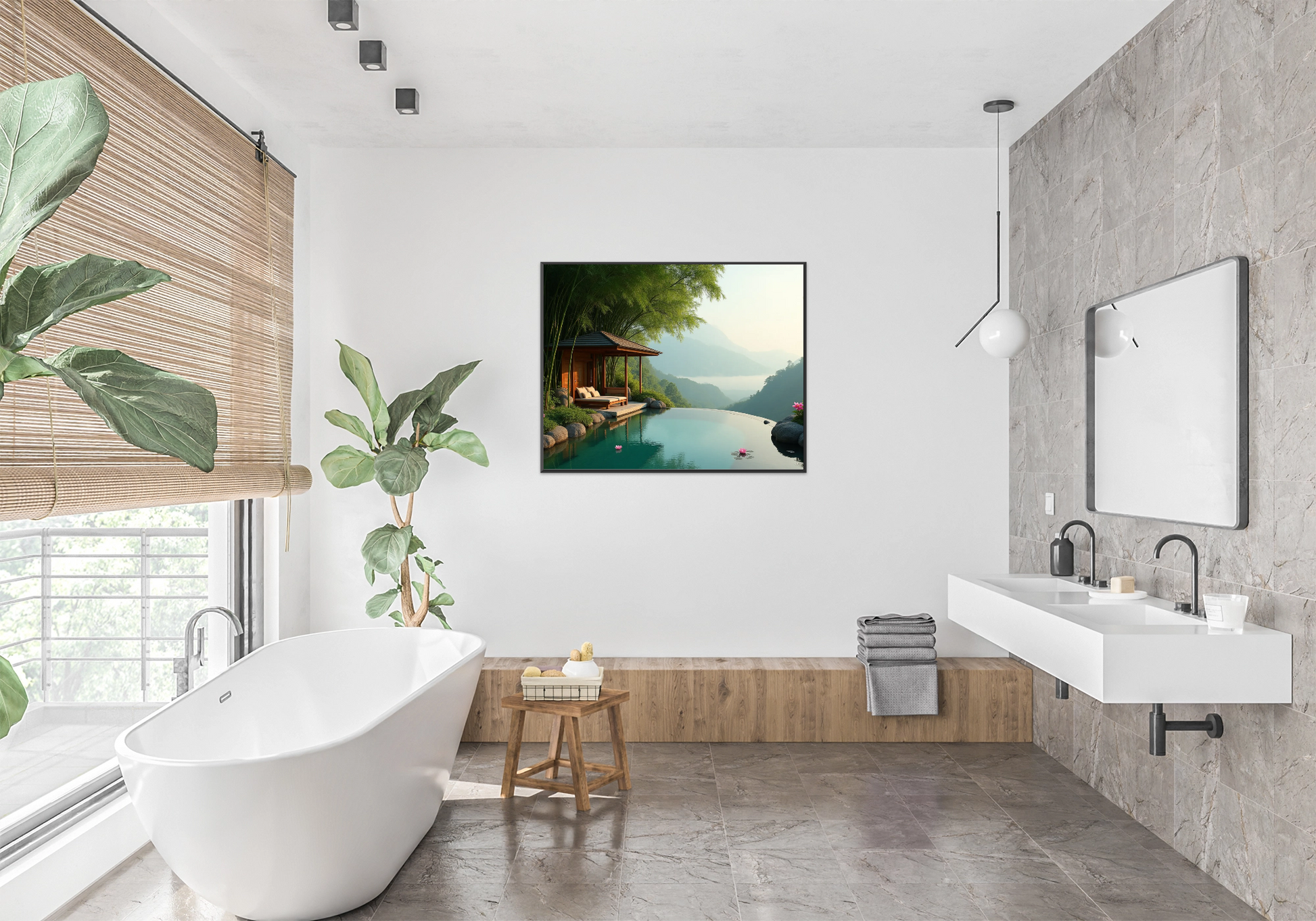 Inmitten dichter Bambushaine liegt ein eleganter Holzpavillon am Rand eines Infinity-Pools, der sich sanft in ein nebelverhangenes Tal öffnet. Wasserrosen treiben ruhig auf der spiegelglatten Oberfläche des Pools und betonen die friedvolle Atmosphäre. Die Kombination aus üppigem Grün, natürlichem Stein und weichen Lichtstimmungen schafft einen perfekten Ort für Rückzug und Entspannung