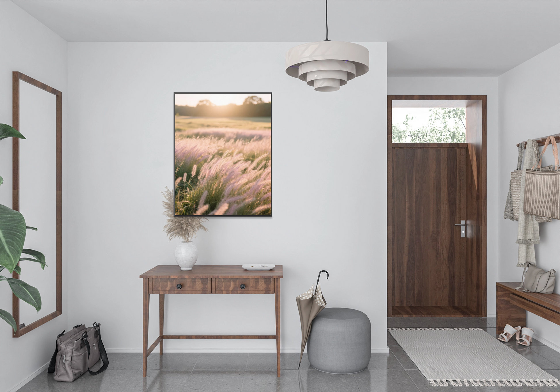 Zarte Gräser wiegen sich im goldenen Licht der tief stehenden Sonne und tauchen die Landschaft in warme Pastelltöne. Die weichen Farben und der sanfte Dunst schaffen eine friedliche, fast träumerische Atmosphäre. Dieses Bild vermittelt Ruhe, Leichtigkeit und den Zauber eines stillen Sommerabends.
