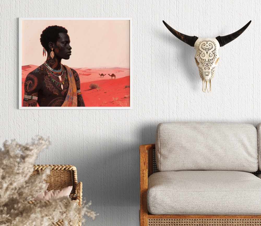 Vor der endlosen Weite roter Dünen steht eine stolze, tätowierte Gestalt mit kunstvollen Schmuckstücken. Ihr Blick ist ruhig und kraftvoll, während im Hintergrund Kamele durch die Landschaft ziehen. Das Bild vereint kulturelle Tiefe mit der zeitlosen Schönheit der Wüste