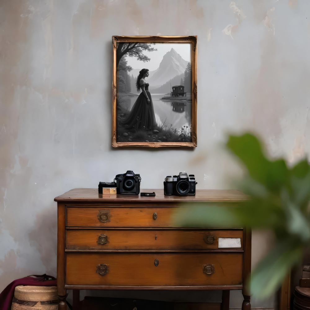 Eine Frau im eleganten Kleid steht verträumt am Ufer eines stillen Sees. Die schwarz-weiße Szenerie mit Bergen, Wald und einem Wagen im Hintergrund wirkt geheimnisvoll und zeitlos. Das Bild vereint Ruhe, Sehnsucht und eine Prise Märchenhaftigkeit.