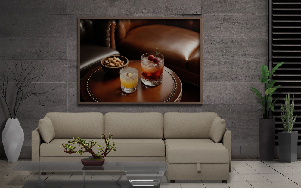 Zwei edle Cocktails stehen auf einem Leder-Loungtisch, begleitet von einer Schale gerösteter Nüsse. Das warme Ambiente der Ledersessel unterstreicht die elegante Stimmung. Ein perfekter Rahmen für entspannte Abende mit einem Hauch von Luxus