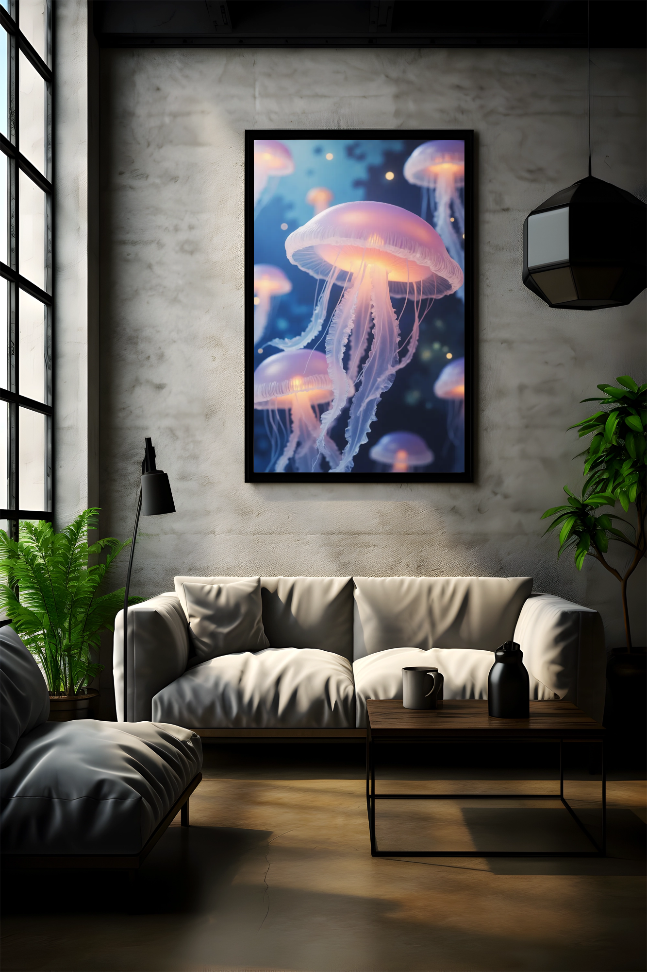 Sanft gleitende Quallen schweben durch die Tiefe des Ozeans, ihre Körper leuchten in zartem Violett und Rosa.