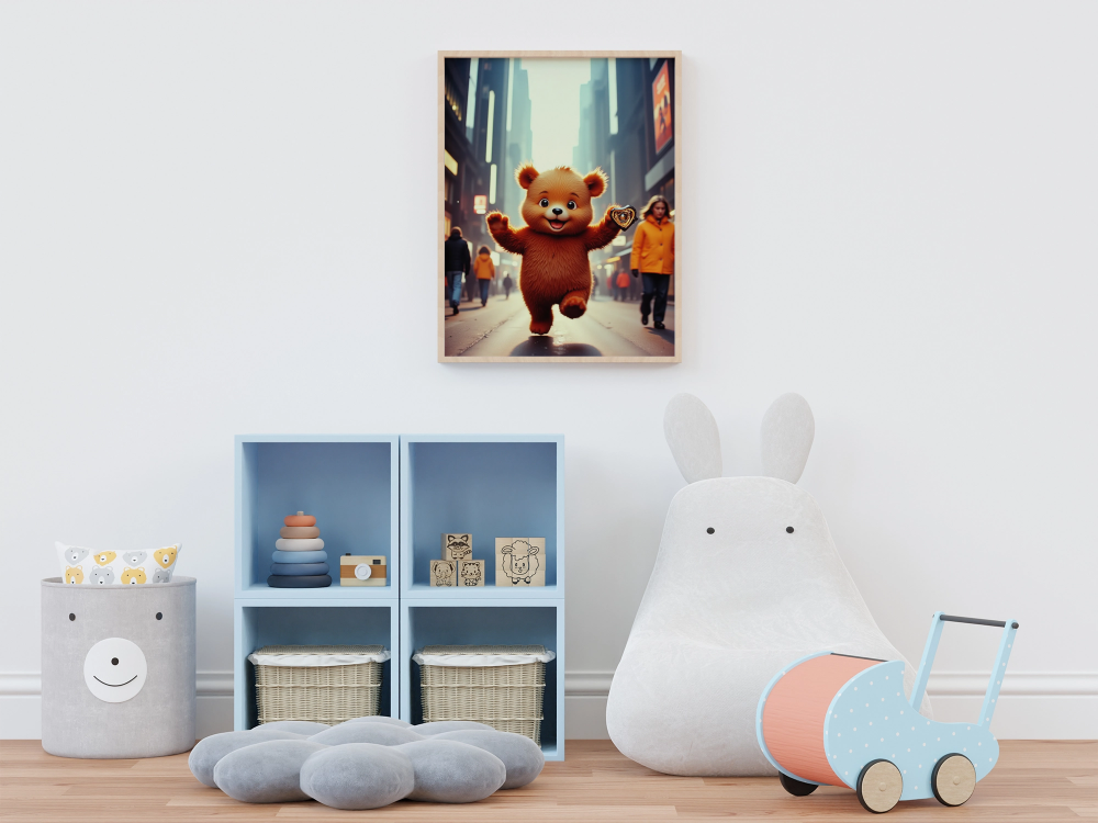 Mit einem breiten Lächeln im Gesicht springt dieser fröhliche Bär durch die belebte Stadt. In seiner Pfote hält er ein Herz voller Freude, das wie ein Symbol für Liebe und Lebenslust wirkt. Seine unbeschwerte Energie zaubert jedem Passanten ein Lächeln ins Gesicht