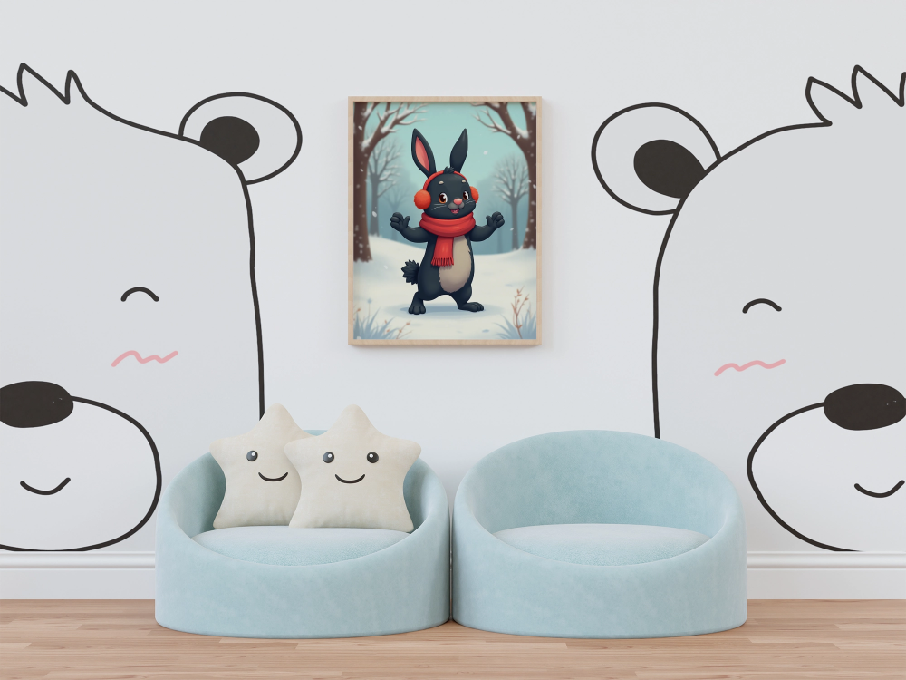 Ein schwarzer Hase genießt den Winter in seiner warmen roten Mütze und dem passenden Schal. Mit fröhlichem Gesichtsausdruck und offenen Armen scheint er den Schnee zu begrüßen. Die Szene strahlt Gemütlichkeit und pure Lebensfreude in der kalten Jahreszeit aus