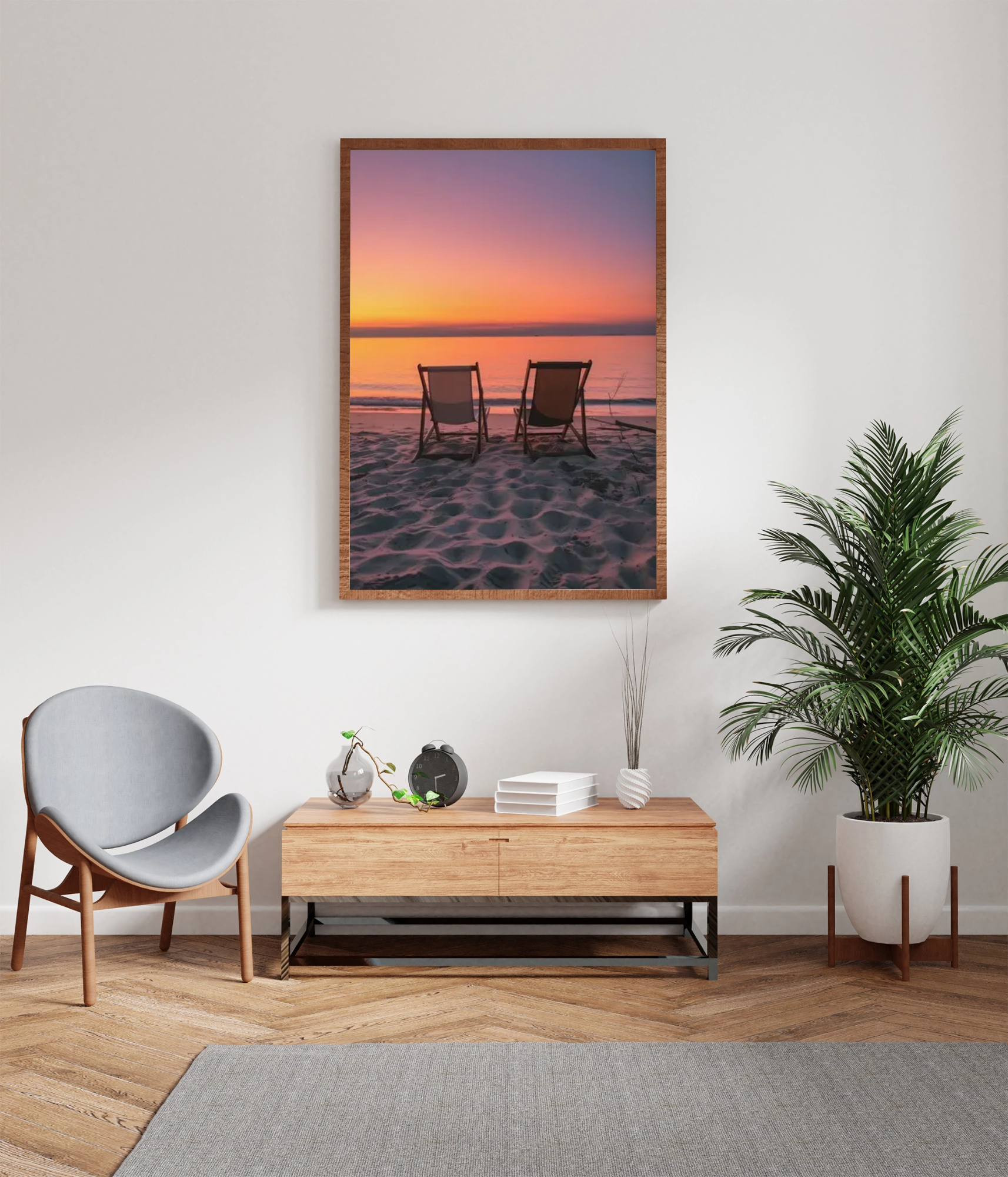 Zwei leere Liegestühle am ruhigen Strand, ein Sonnenuntergang in Pastell – dieses Bild fängt den perfekten Moment der Stille ein. Ideal für alle, die sich nach Meeresrauschen, warmem Sand und unendlichem Horizont sehnen.