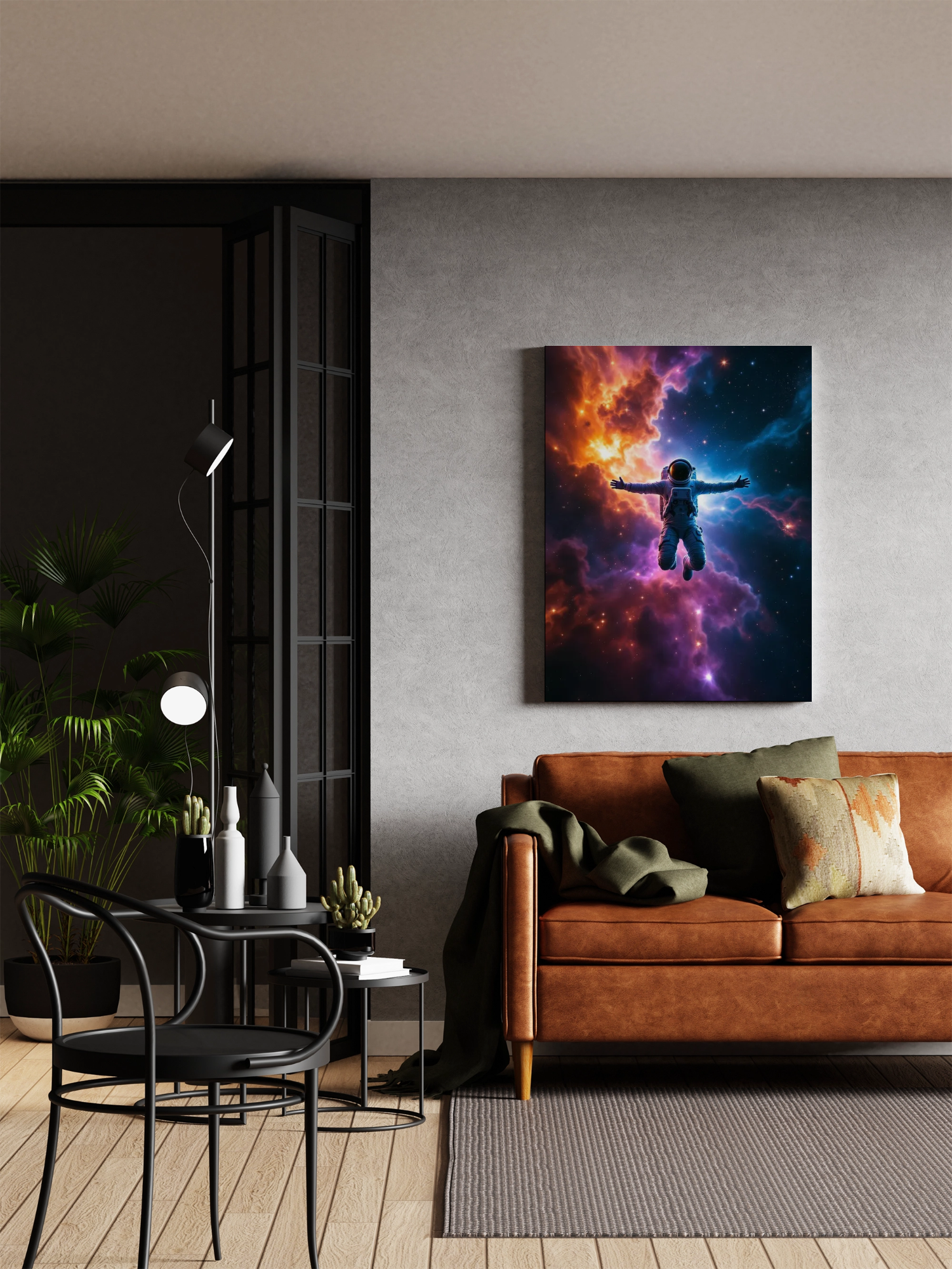 Ein Astronaut treibt schwerelos im leuchtenden Farbenmeer eines galaktischen Nebels. Die Arme ausgebreitet, scheint er eins mit dem Universum zu werden. Diese Szene fängt den Zauber grenzenloser Freiheit und die Magie des Kosmos ein